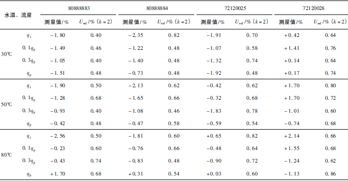 (2)累積體積(質量法)相對示值誤差測量結果中,山東院在水溫80℃、qi點處與參考值的差值最大,為+0.31%(72120025);山西院在水溫30℃、0.3qp點處與參考值的差值最大,為+0.36%(72120028)。由于比對樣品在一些試驗點上的測量重復性不是很好,差值的擴展不確定度最大達到了1.35%。