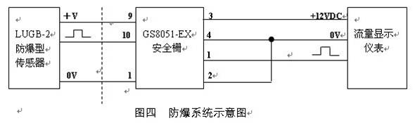 防爆型傳感器必須與合適的關聯(lián)設備——安全柵組成本質安全型防爆系統(tǒng) (見下圖),通過電源信號安全柵再連接到流量顯示儀表上。