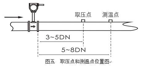 3、取壓點和測溫點,應分別在傳感器的下游3~5DN處和6~8DN處(見圖五)。