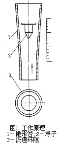 金屬轉子流量計的流量檢測元件是由一根自下向上擴大的垂直錐形管和一個沿著錐管軸上下移動的浮子組所組成。工作原理如圖1所示,被測流體從下向上經過錐管1和浮子2形成的環隙3時,浮子上下端產生差壓形成浮子上升的力,當浮子所受上升力大于浸在流體中浮子重量時,浮子便上升,環隙面積隨之增大,環隙處流體流速立即下降,浮子上下端差壓降低,作用于浮子的上升力亦隨著減少,直到上升力等于浸在流體中浮子重量時,浮子便穩定在某一高度。浮子在錐管中高度和通過的流量有對應關系。