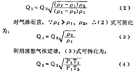 如果兩種不同密度ρ1、ρ2的介質(zhì)分別通過同臺轉(zhuǎn)子流量計(jì)時,若浮子平衡在同一位固上,由(1)式得轉(zhuǎn)子流量計(jì)密度換算的基本式: