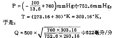 例:使用某空氣采樣儀,運(yùn)行時,采樣儀上轉(zhuǎn)子流量計(jì)讀數(shù)為500毫升/分,測表前壓為—100mmH 20(因使用抽氣泵,所以是負(fù)壓),現(xiàn)場溫度為30℃,求此時空氣的實(shí)際流量值。