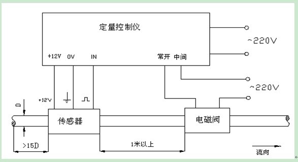2、定量值設(shè)定完后,按下啟動按鈕電磁閥、水泵打開,流量計開始工作。儀表右邊窗口開始根據(jù)左邊定量值累加,等達(dá)到定量值后電磁閥、水泵自動關(guān)閉,定量結(jié)束。